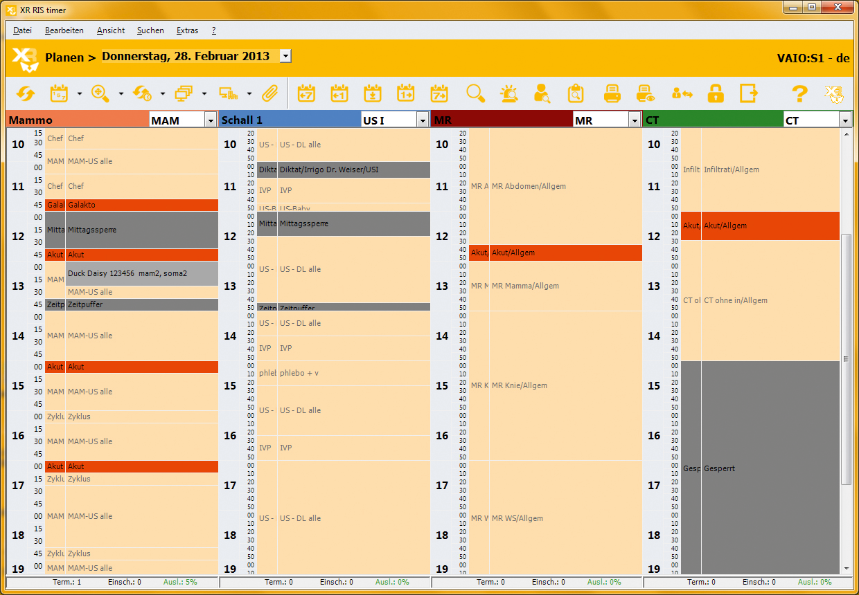 Radiologische Betriebe haben sehr spezielle Anforderungen an Terminvergabesysteme: CT, MR, Röntgen, Mammografie, Ultraschall, NUK, PET, Therapie, um nur einige zu nennen. Darüber hinaus auch noch differenzierte Untersuchungsbereiche, Raumtaktungen, Untersuchungsdauer und das Bedürfniss nach effizienter Personaleinsatzplanung.