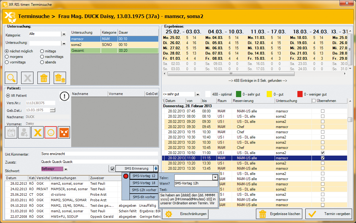 Die bestehenden Patientenstammdaten sind natürlich auch im XR RIS timer sofort verfügbar. Schon bei der telefonischen Terminvereinbarung sieht Ihr Office-Personal: War die zu untersuchende Person schon einmal da? Welche vergangenen Termine und Untersuchungen wurden durchgeführt? Allergien?